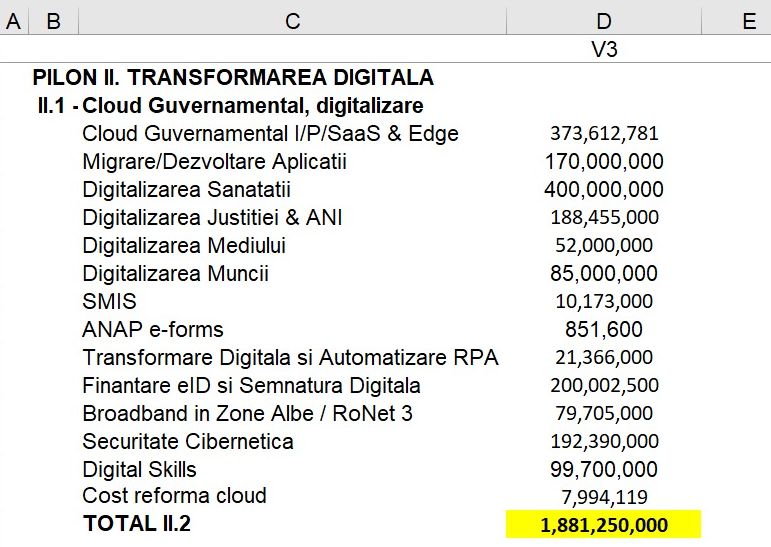 În anexele la PNRR este prezentată o detaliere a celor 1,89 miliarde de euro care vor lua calea digitalizării