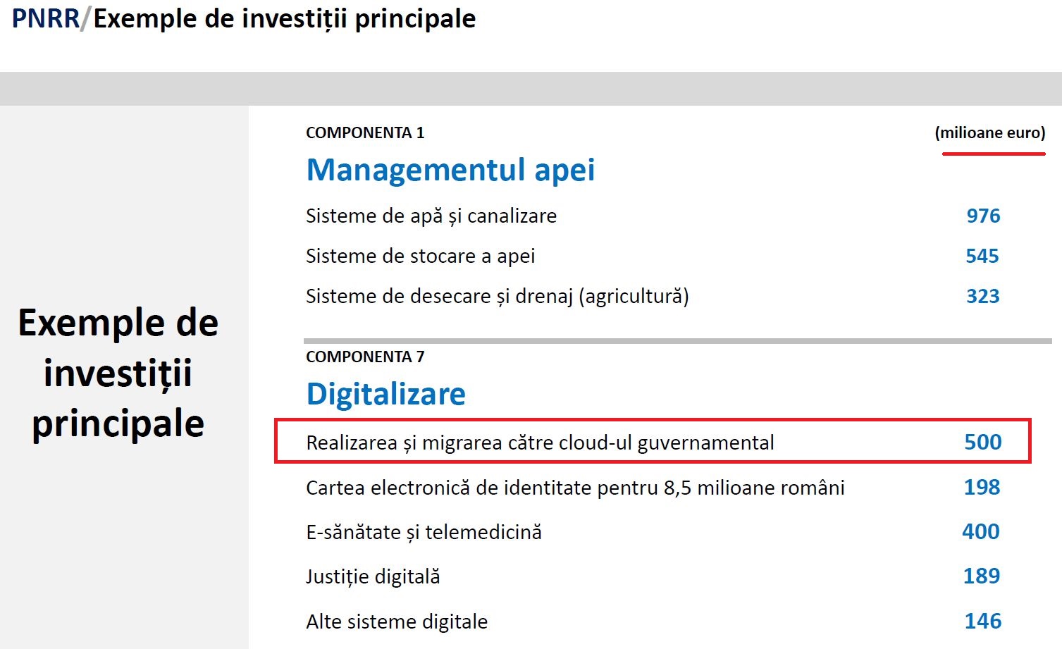 Pentru cloud guvernamental este alocată suma de peste 373 milioane de euro, iar pentru migrare/dezvoltare aplicații – alte 170 milioane de euro.