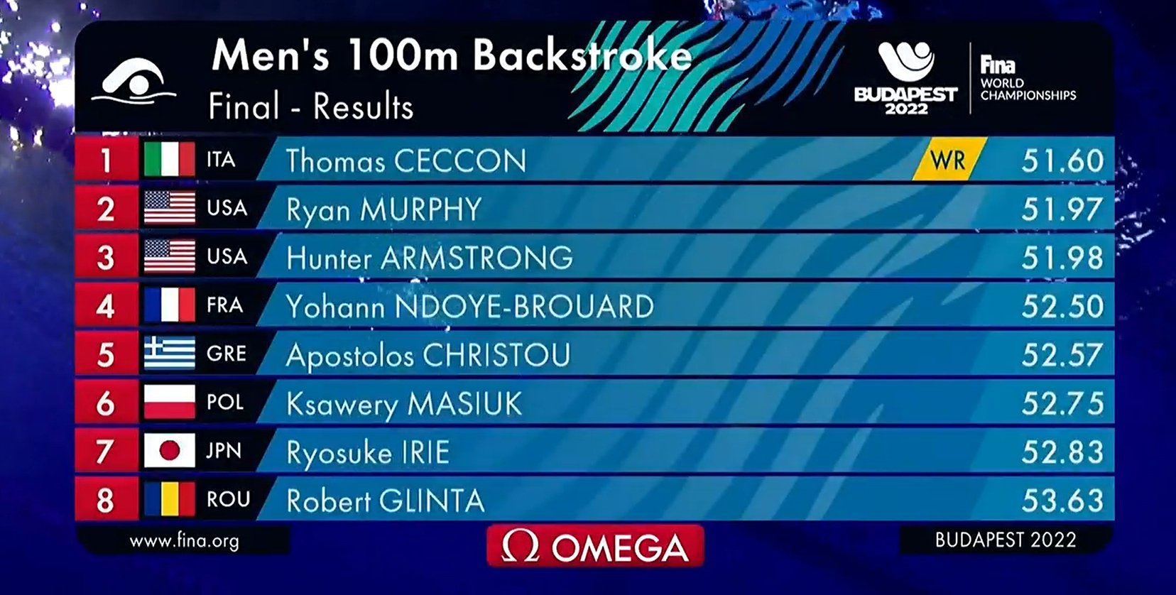 Titlul de la Budapesta a fost câştigat de italianul Thomas Ceccon (51.60 – nou record mondial), urmat de americanii Ryan Murphy (51.97) și Hunter Armstrong (51.98).
