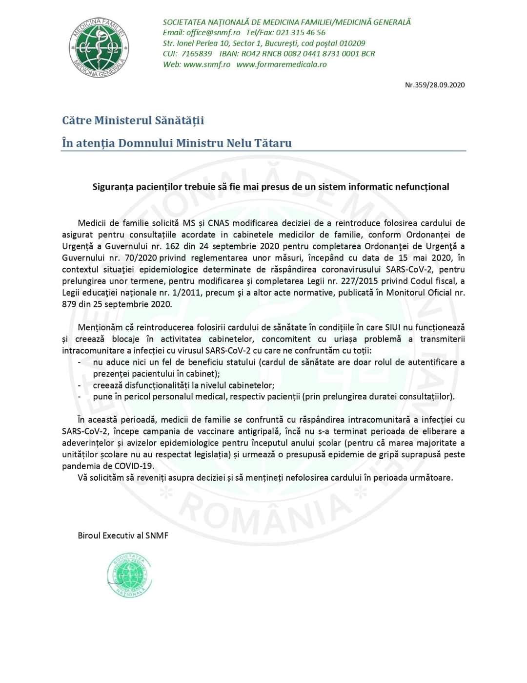 De altfel, Societatea Națională de Medicina Familiei a transmis solicitări către Ministerul Sănătății și Casa de Asigurări de Sănătate în care cere modificarea deciziei de a reintroduce folosirea cardului de asigurat pentru consultațiile acordate în cabinetele medicilor de familie: