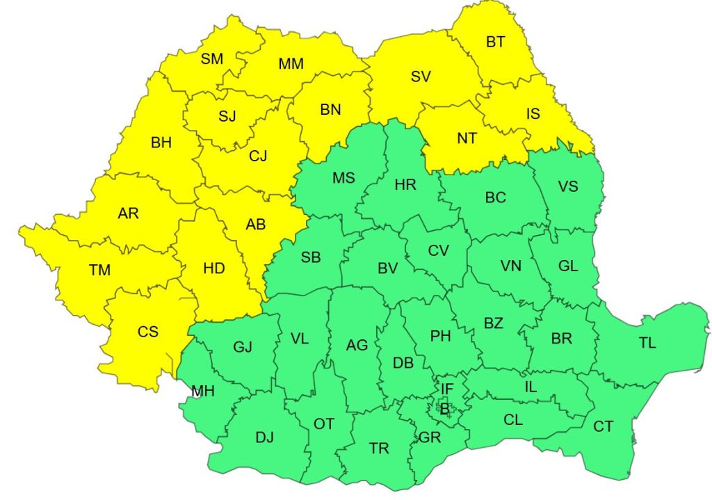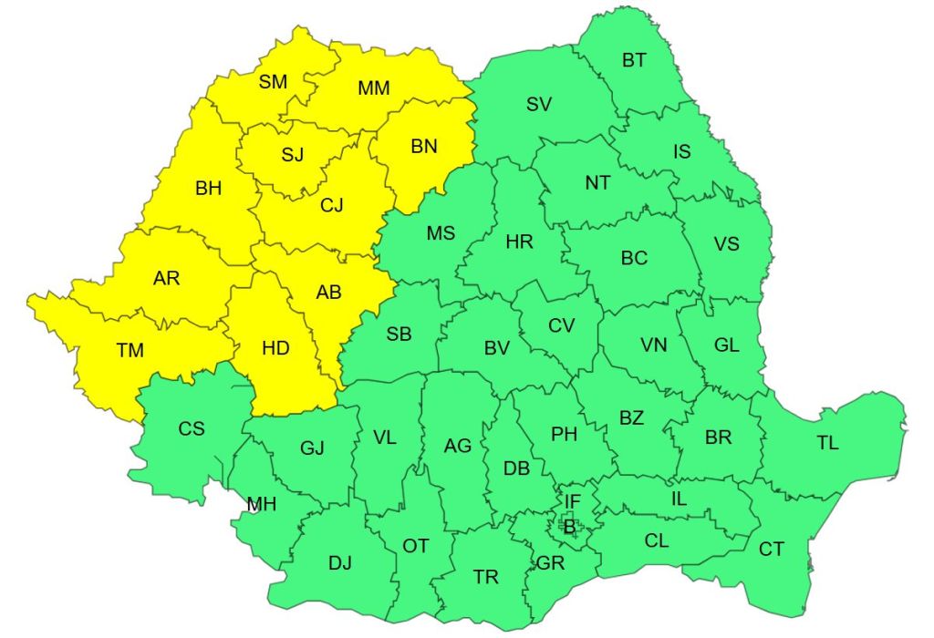 Județele avertizate sâmbătă sunt: Alba, Arad, Bihor, Bistrița-Năsăud, Cluj, Hunedoara, Maramureș, Sălaj, Satu Mare și Timiș.