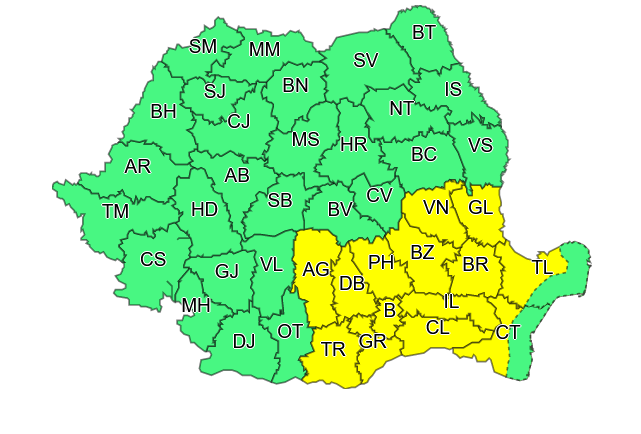 Administraţia Naţională de Meteorologie a emis, sâmbătă, un cod galben de furtuni pentru Muntenia, sudul Moldovei şi Dobrogea continentală, valabil de la ora 14:00 până la ora 22:00.