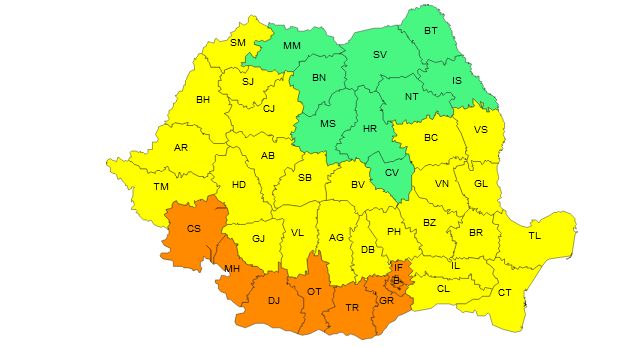 Sunt vizate de atenţionarea Cod galben judeţele Satu-Mare, Bihor, Arad, Timiş, Sălaj, Cluj, Alba, Hunedoara, Gorj, Sibiu, Vâlcea, Braşov, Argeş, Dâmboviţa, Prahova, Bacău, Vrancea, Buzău, Ialomiţa, Clăraşi, Vaslui, Galaţi, Brăila, Tulcea şi Constanţa.