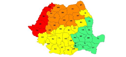 Cod portocaliu de instabilitate atmosferică accentuată în intervalul 7 iulie, ora 13 – 7 iulie, ora 21. În nordul Banatului, Crișana, Maramureș, cea mai mare parte a Transilvaniei și nordul Moldovei vor fi vijelii puternice (viteze ale vântului de 70…90 km/h), grindină de medii și mari dimensiuni (2-5 cm), frecvente descărcări electrice și averse torențiale. În intervale scurte de timp (1-3 ore) cantitățile de apă vor fi de 25…40 l/mp și pe arii restrânse vor depăși 50 l/mp.