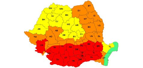 Cod portocaliu de caniculă în perioada 8 iulie, ora 10 – 9 iulie, ora 10. În sudul Banatului, centrul și sudul Transilvaniei, estul și sudul Moldovei, nord-estul Munteniei și sudul Dobriogei continentale valul de căldură se va menține, va fi caniculă, disconfort termic accentuat, iar indicele temperatură-umezeală (ITU) va depăși pragul critic de 80 de unități. Temperaturile maxime se vor încadra între 36 și 38 de grade, iar minimele se vor situa între 16 și 20 de grade.