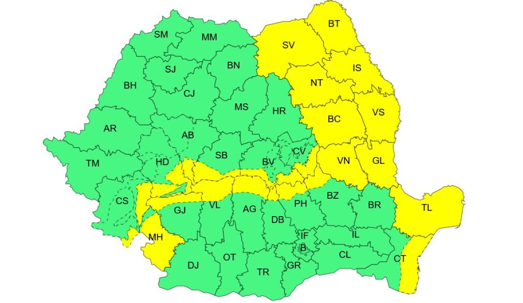 De asemenea, meteorologii au prelungit codul galben de vânt puternic până luni seară, însă a fost restrâns numărul de județe afectate.