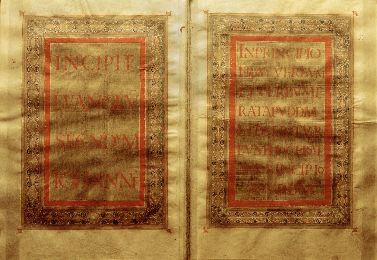 Nu se ştie când şi cum manuscrisul carolingian a fost desfăcut în două. Cealaltă jumătate, respectiv Evangheliile după Luca şi Ioan, se află la Vatican. Tot la Roma se găseşte una dintre coperţi, cea de-a doua fiind la un muzeu din Londra.