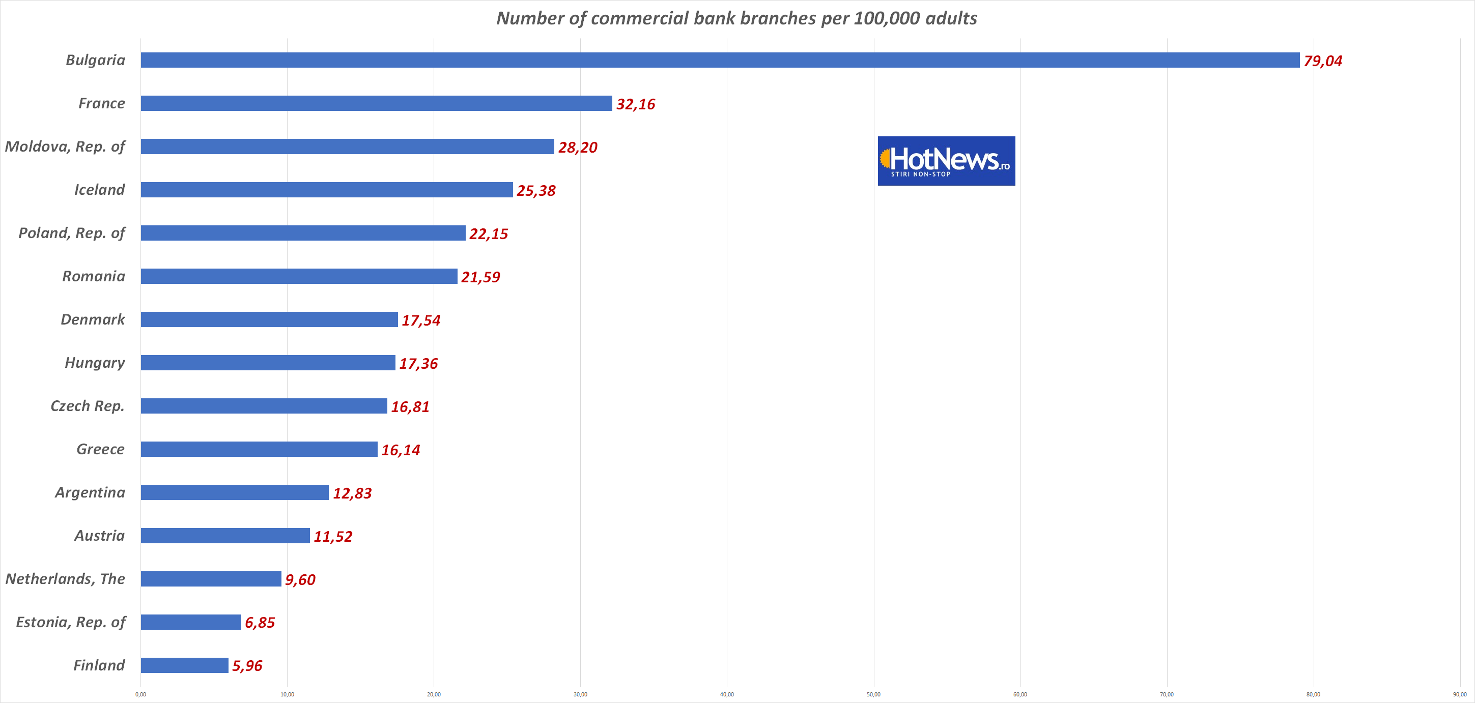 Iar la numărul agențiilor care revin la suta de mii de adulți, lucrurile arată la fel de rău. Dacă vă uitați pe cele mai recente statistici ale FMI – e o hartă interactivă- o sa vedeți că România stă mai prost decât țările din jur