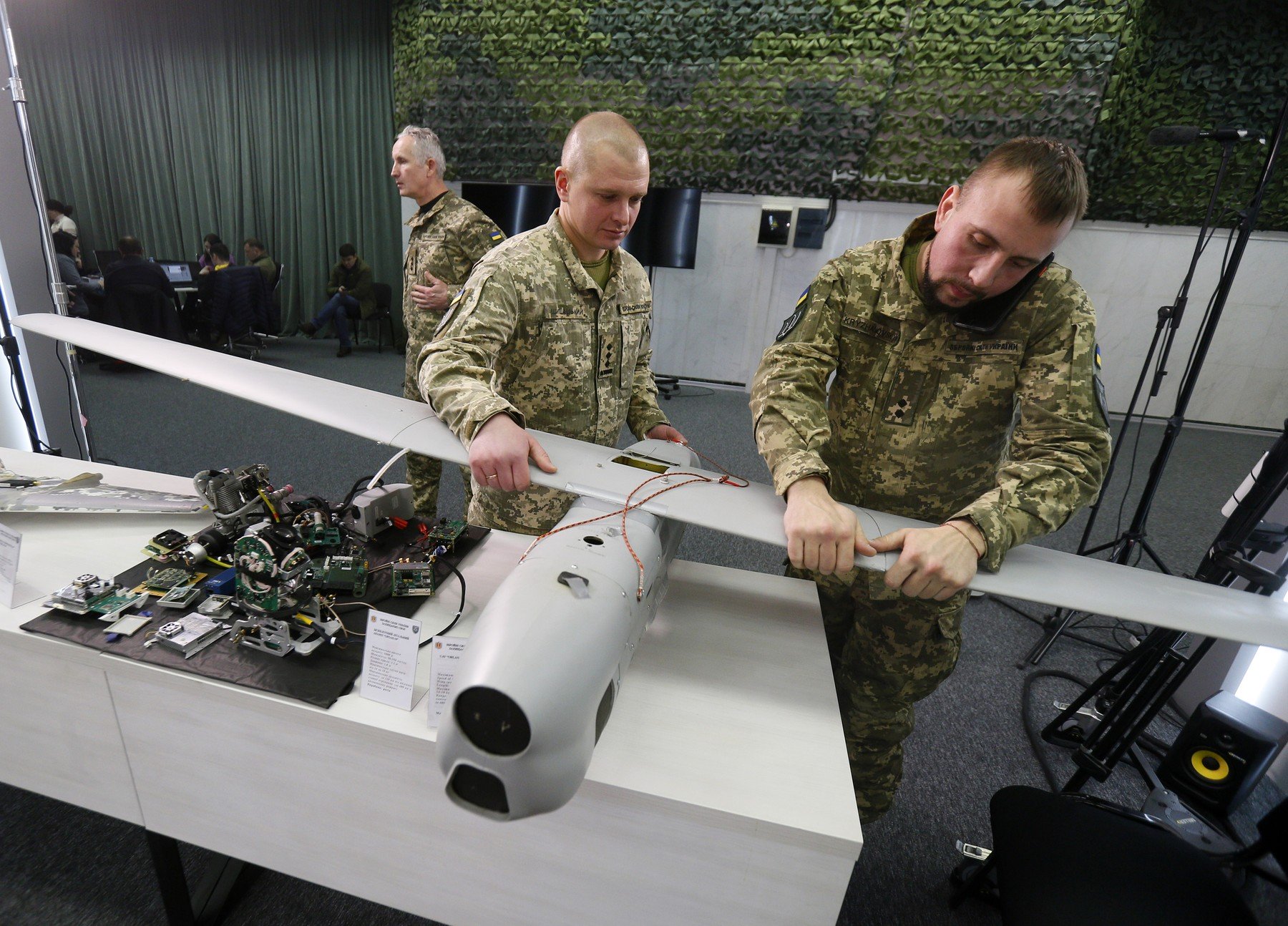 Parti ale dronei rusesti Orlan-10, folosita impotriva Ucrainei, prezentate intr-o conferinta de presa Fortelor de Securitate ucraineneFoto: Vladimir Sindeyeve/NurPhoto / Shutterstock Editorial / Profimedia