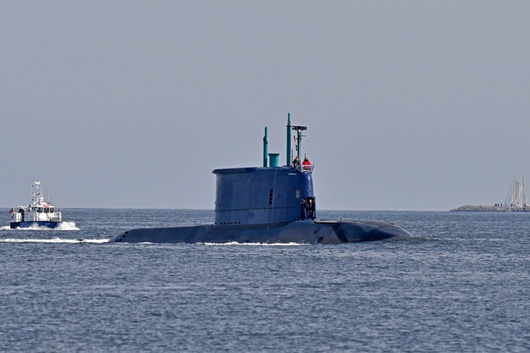 Submarinul TKMS 05 (INS DRAKON) se îndreaptă spre portul Kiel, întorcându-se în urma unor teste pe mare, efectuate în Skagerak, pe 29 august 2025.
