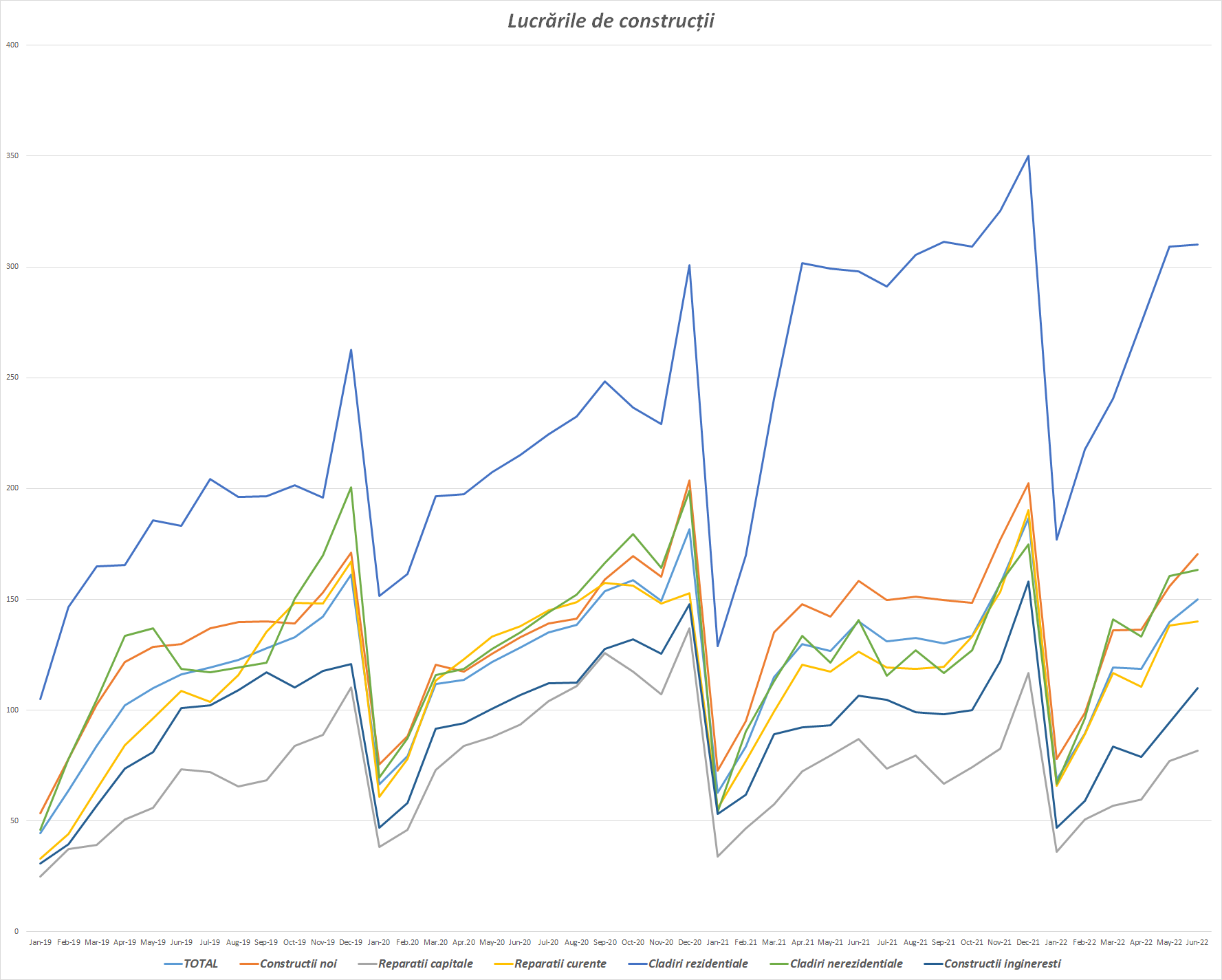 Volumul lucrărilor de construcţii a crescut, ca serie brută, cu 7,2%, creştere evidenţiată la lucrările de construcţii noi (+9,4%), lucrările de reparaţii capitale (+6,3%) şi la lucrările de întreţinere şi reparaţii curente (+1,4%).