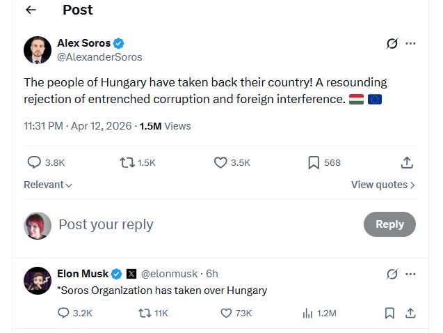Fiul miliardarului George Soros, Alex, a salutat victoria partidului de opoziție Tisza, după alegerile parlamentare de duminică. Șeful Tesla Elon Musk a venit la scurt timp cu o replică.