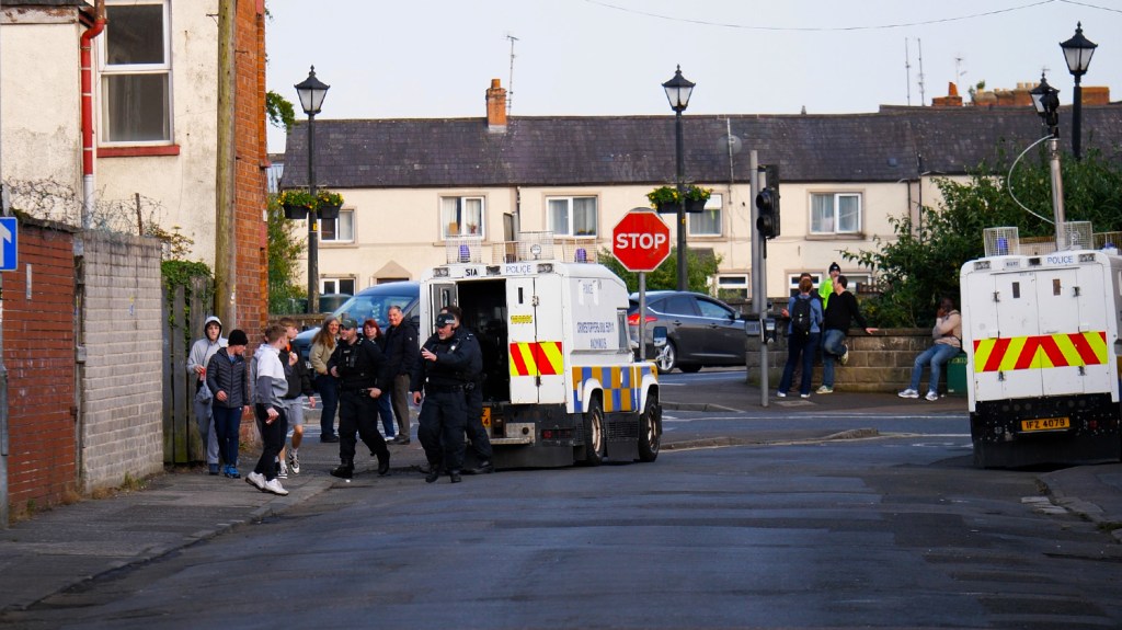 Ballymena, Irlanda de Nord. Poliția verifică un grup de tineri pe una din străzile pe care au loc proteste. FOTO: Adi Iacob / HotNews