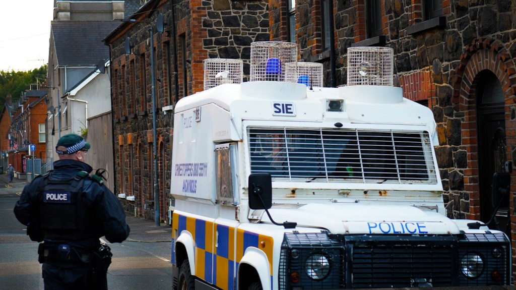 Mașină de poliție pe strada cu protestele din Ballymena, Irlanda de Nord