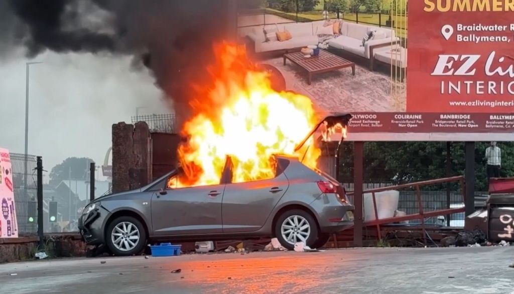 Mașina incendiată de protestatarii din Ballymena. Foto: Captură video / YouTube