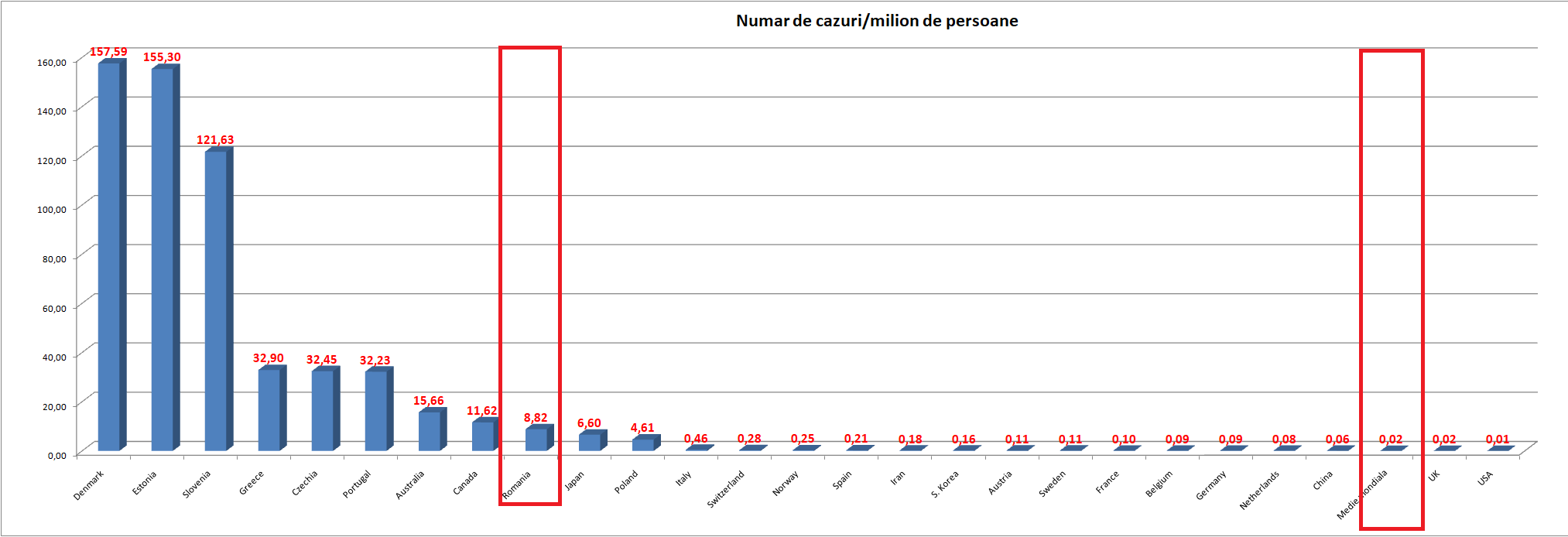 Estonia e pe locul al doilea, cu 155,3 cazuri/milionul de locuitori.