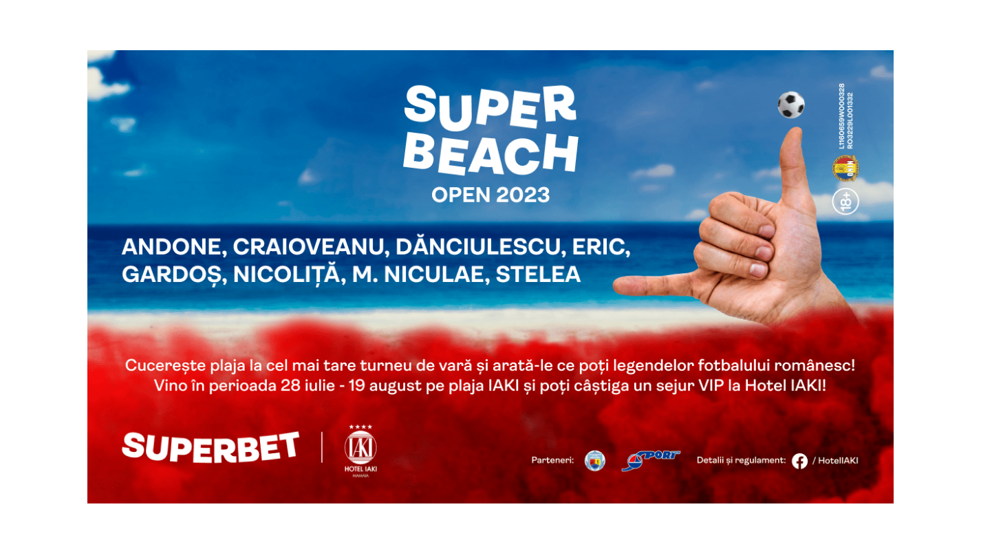 Superbet și partenerii de la Hotel IaKi te cheamă la Superbeach Open, în perioada 28 iulie – 19 august. Vii cu prietenii (se joacă în sistem 5 la 5) și în fiecare zi de vineri și sâmbătă, între orele 17:00-21:00 poți impresiona ambasadorul Superbet sau influencerul Super Social care e selecționerul zilei. El își va alege echipa pe care o va antrena la turneul final care va avea loc sâmbătă 26 august, pe terenul pe care s-au disputat și turneele de preselecție: plaja IaKi!