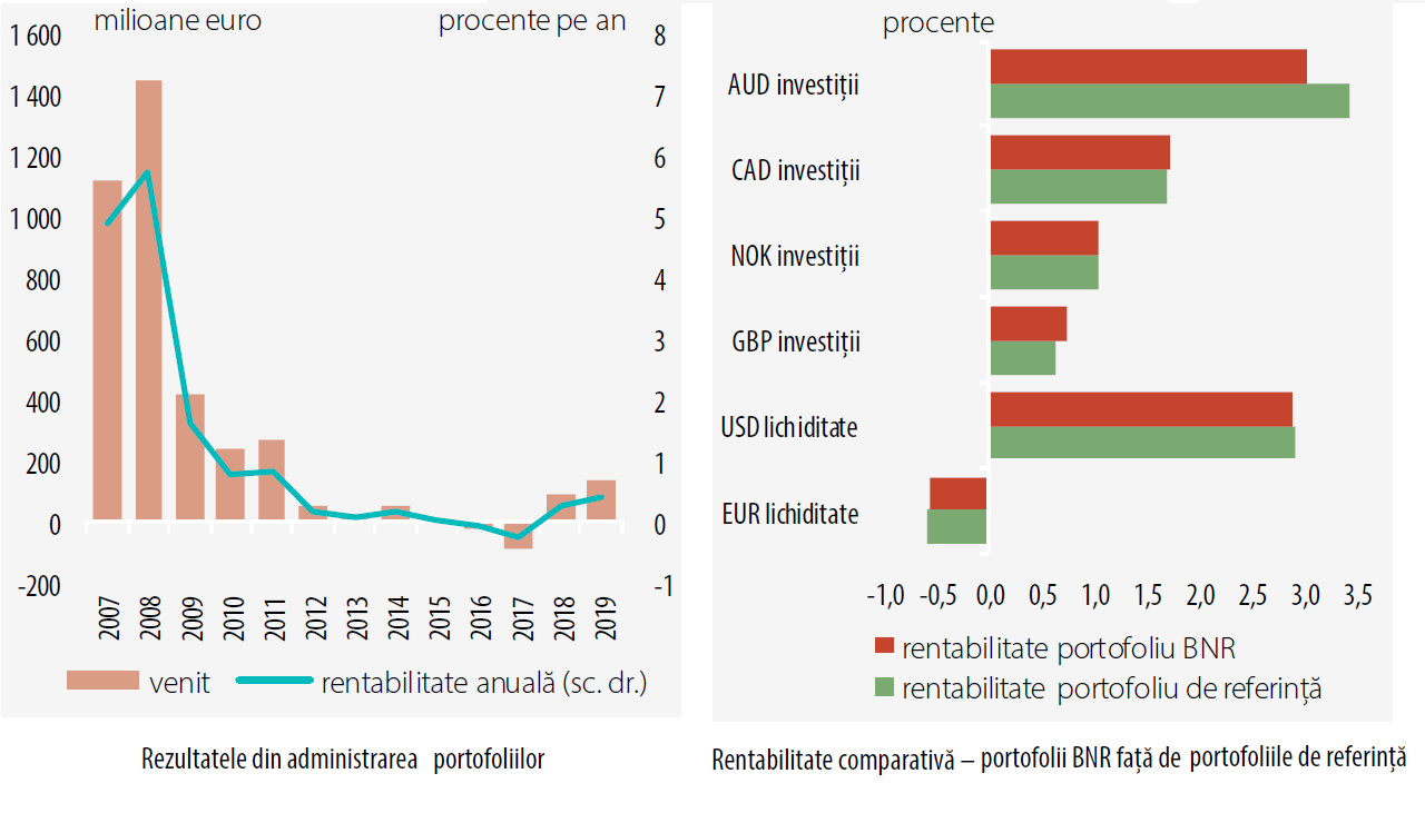 - Scăderea nivelurilor randamentelor la care au fost remunerate investițiile realizate în cadrul activității de administrare a rezervelor internaționale a contribuit la diminuarea veniturilor potențiale din plasamente, dar efectul pozitiv al aprecierii de capital a fost dominant și a determinat creșterea rentabilității anuale obținute din administrarea portofoliilor, de la 0,3% în anul 2018 la 0,41% în 2019. În același interval, veniturile economice aferente activității de administrare a portofoliilor au crescut de la 98 milioane echivalent euro la 138 milioane echivalent euro.