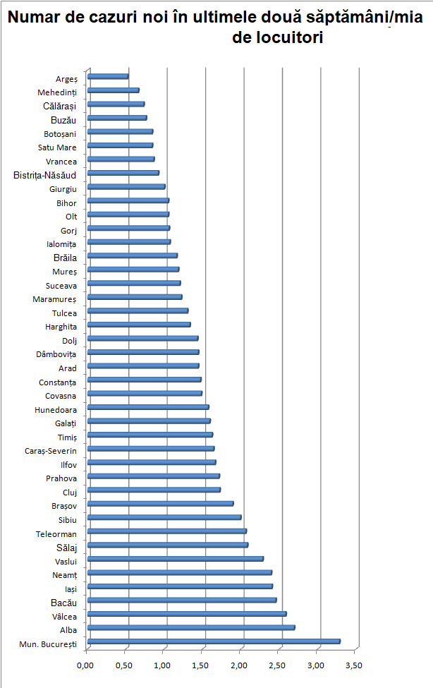 Dacă împărțim numărul de cazuri noi din ultimele 14 zile la numărul populației din fiecare județ (am luat în calcul populația rezidentă transmisă de Statistică), obținem următorii coeficienți la mia de locuitori: