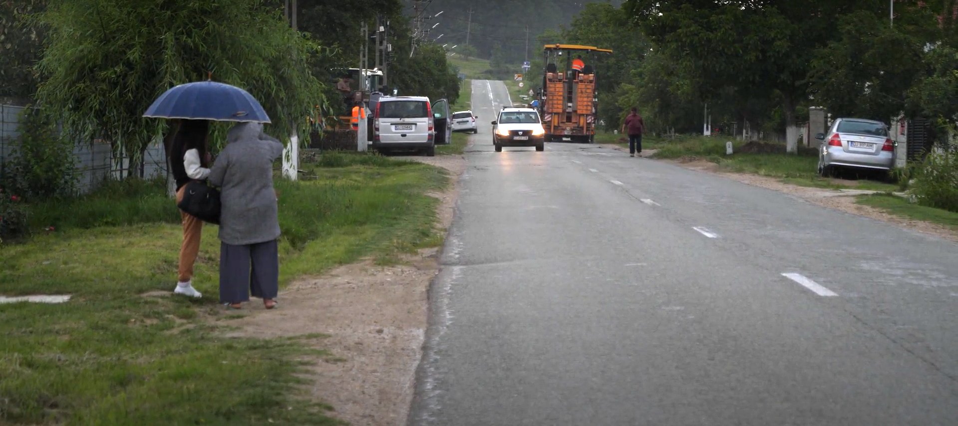 „Merge și pe ploaie asfaltarea… Se așază mai bine materialul. Deci asfaltul se pune încins și când vine peste el cu compresorul, ploaia îl întinde şi îl răceşte. Și așa ei stropeau cu apă după asfaltare”, își dă cu părerea un sătean.