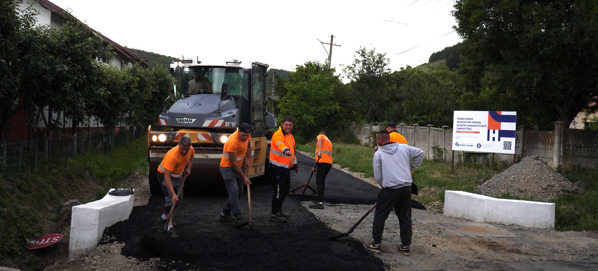 La Cruşeţ vin nori negri de furtună. Lucrătorii nu privesc cerul. Modelează asfaltul cu lopata şi-apoi îl tasează cu maşini grele. Cele câteva picături de ploaie nu-i sperie. Lucrarea merge mai departe.