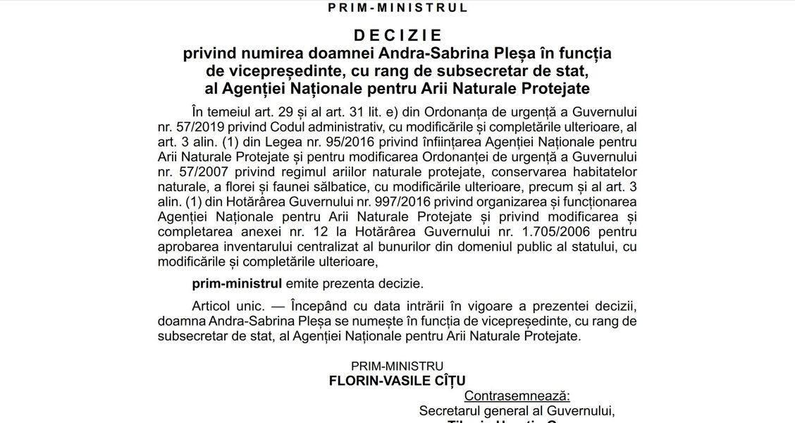 ”În temeiul art. 29 şi al art. 31 lit. e) din Ordonanţa de urgenţă a Guvernului nr. 57/2019 privind Codul administrativ, cu modificările şi completările ulterioare, al art. 3 alin. (1) din Legea nr. 95/2016 privind înfiinţarea Agenţiei Naţionale pentru Arii Naturale Protejate şi pentru modificarea Ordonanţei de urgenţă a Guvernului nr. 57/2007 privind regimul ariilor naturale protejate, conservarea habitatelor naturale, a florei şi faunei sălbatice, cu modificările ulterioare, precum şi al art. 3 alin. (1) din Hotărârea Guvernului nr. 997/2016 privind organizarea şi funcţionarea Agenţiei Naţionale pentru Arii Naturale Protejate şi privind modificarea şi completarea anexei nr. 12 la Hotărârea Guvernului nr. 1.705/2006 pentru aprobarea inventarului centralizat al bunurilor din domeniul public al statului, cu modificările şi completările ulterioare, prim-ministrul emite prezenta decizie. Articol unic. — Începând cu data intrării în vigoare a prezentei decizii, doamna Andra-Sabrina Pleşa se numeşte în funcţia de vicepreşedinte, cu rang de subsecretar de stat, al Agenţiei Naţionale pentru Arii Naturale Protejate”, este decizia pblicată în Monitorul Oficial.