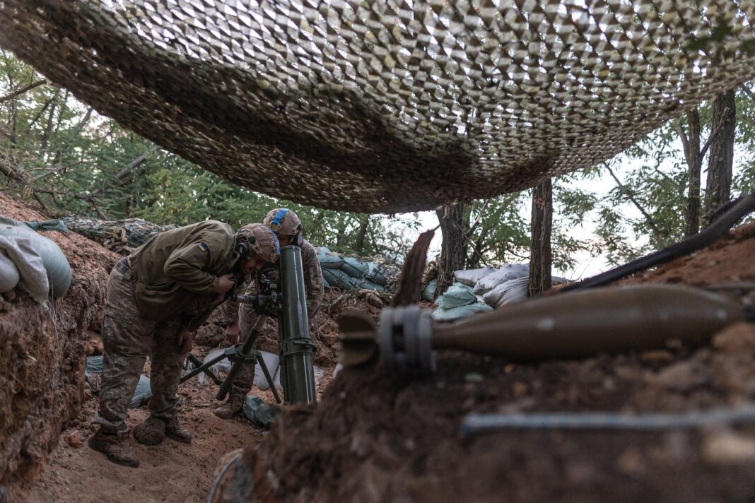 Soldați ucraineni din batalionul „Lupii lui Da Vinci” pregătesc un mortier în direcția Pokrovsk, Donețk, Ucraina, 31 iulie 2024.