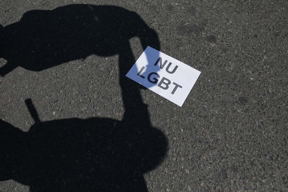 Un mesaj anti LGBTQ, rămas de la un miting al asociației „Noua Dreaptă”. FOTO: Inquam Photos / Octav Ganea