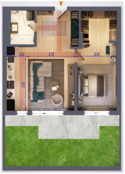 Prin urmare, canapeaua va sta pe singurul perete rămas neocupat, iar televizorul pe peretele cel scurt dintre ușă și fereastră (șpalet) – unde se poate fixa cu un braț articulat direct de perete, pentru a se putea așeza cu ecranul paralel cu latura lungă a canapelei, sau i se poate confecționa pe comandă o piesă de mobilier cu o formă stranie, pe care să aibă loc să stea rotit.