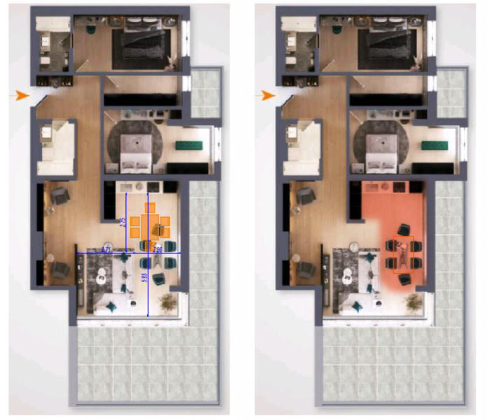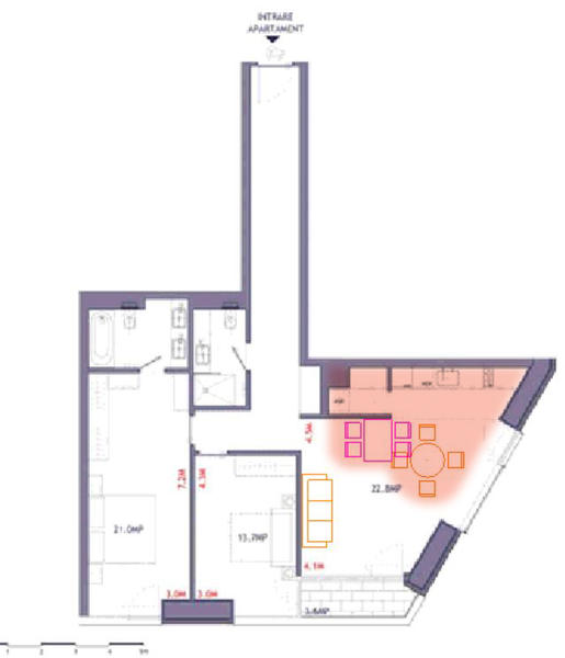 Dacă locul de masă se va ține unde a fost poziționat de dezvoltator ajungem la cazul precedent: cine se uită la televizor va sta cu ochii la aproximativ 2,00 m de televizor, pentru că cei 2,20 m lăsați în spatele canapelei până la perete nu permit ridicarea de la masă a persoanelor de pe laturile lungi ale mesei. Necesarul de spațiu pentru buna funcționare a locului de luat masa sabotează și aici dimensiunile livingului.