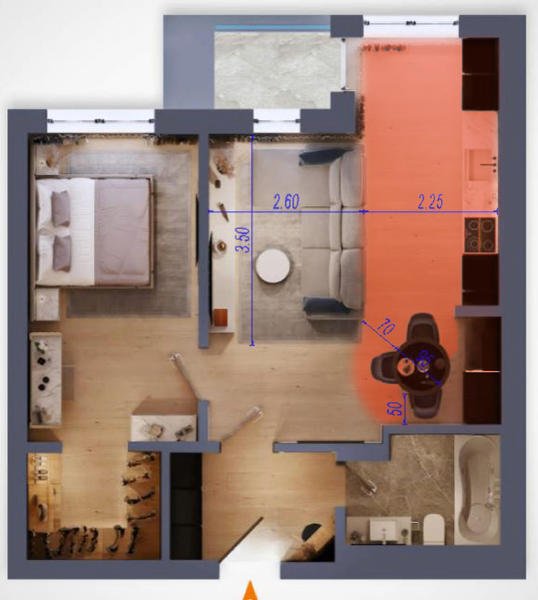 Dacă bucătăria din plan era închisă, masa ar fi trebuit să ocupe porțiunea din fața intrării în living. Nu este, deci dezvoltatorul poate “vinde” iluzia că fragmentul de living de acolo are valoare pentru locatar. De fapt, zona respectivă funcționează ca un fragment de hol mai larg.