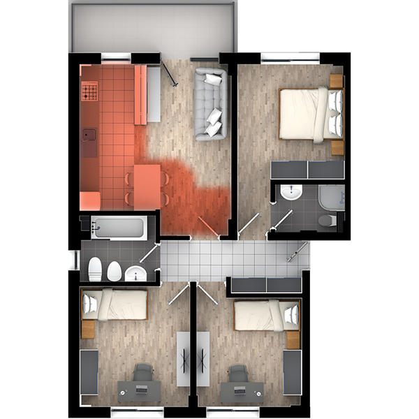 Apartamentul de trei camere din imagine este spațios, dar are aceeași problemă cu locul de luat masa: acesta se putea muta mai sus dar, fiind de șase persoane – conform promisiunii de huzur din imaginea oferită de dezvoltatorul cinstit, ocupă mult.