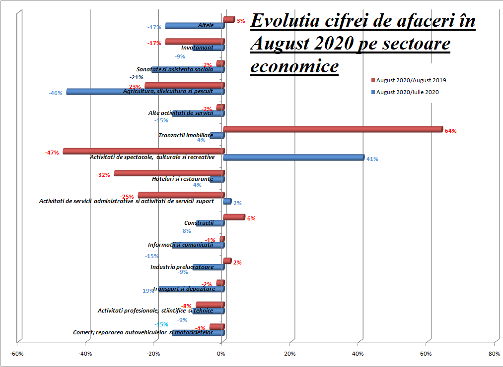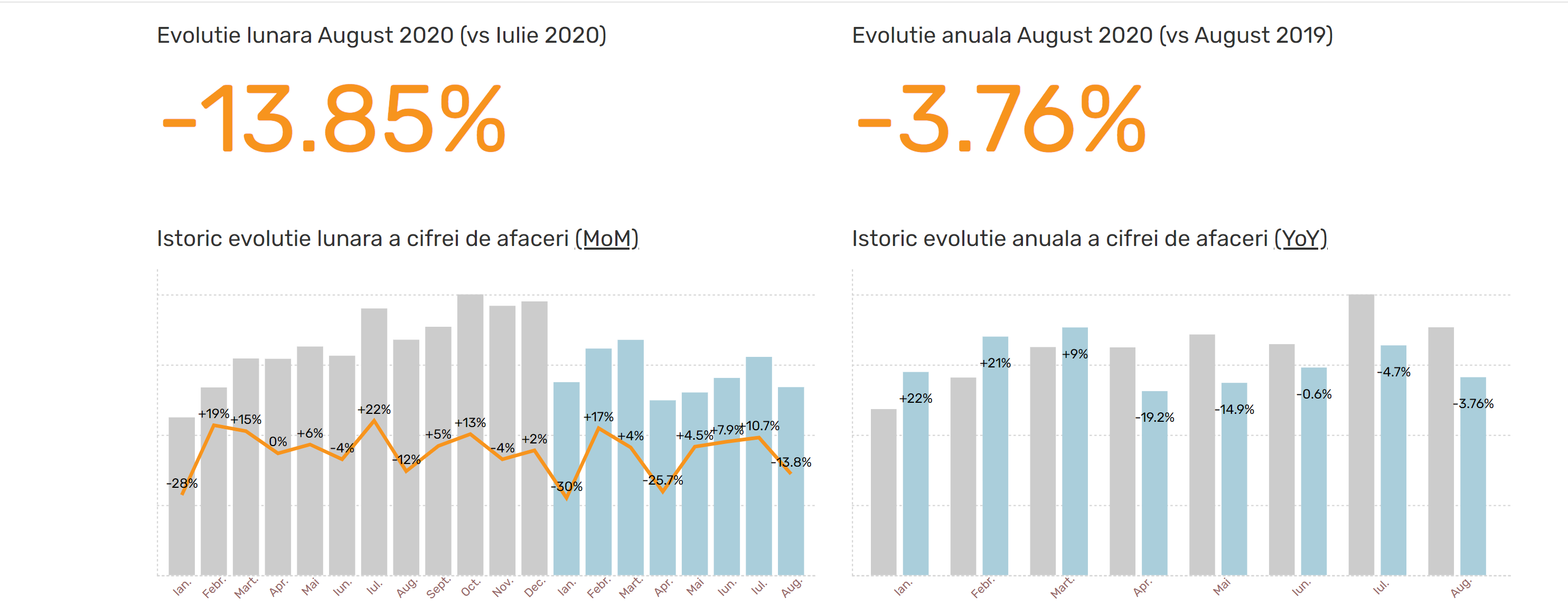 La modul general, afacerile au scăzut în august cu 13,8% față de iulie și cu 3,76% față de august 2019.