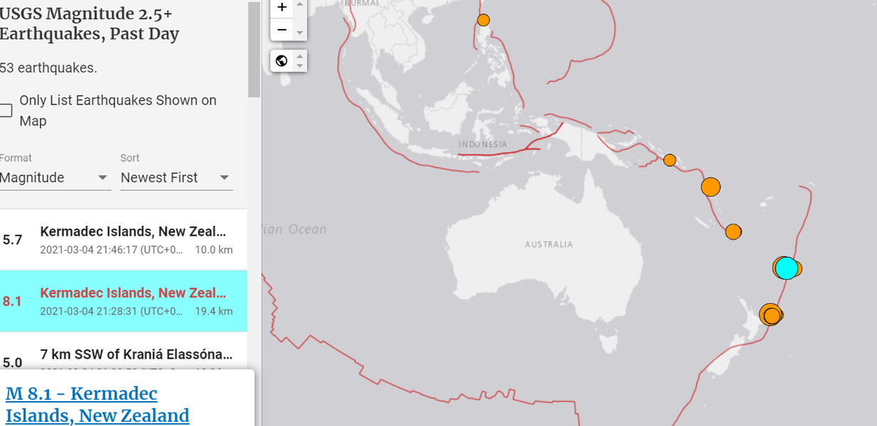 Un seism cu o magnitudiine de 8,1 a avut loc joi în largul insulelor Kermadec, informează Institutul american de Geofizică (USGS) și au fost emise ordine de evacuare pentru localnicii care trăiesc în zonele de pe coasta de est a Insulei de Nord.