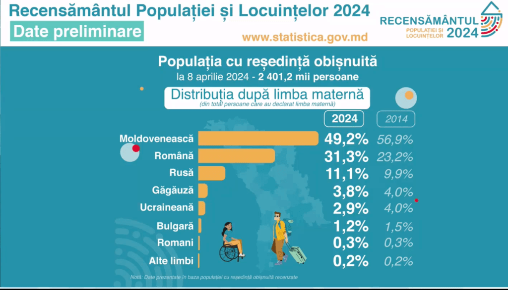 - 49,2% din populația Republicii Moldova a răspuns la întrebările recenzorilor că vorbește „limba moldovenească”, ca limbă maternă, deși aceasta nu mai există din 2023, fiind înlocuită cu limba română, inclusiv în Constituție.