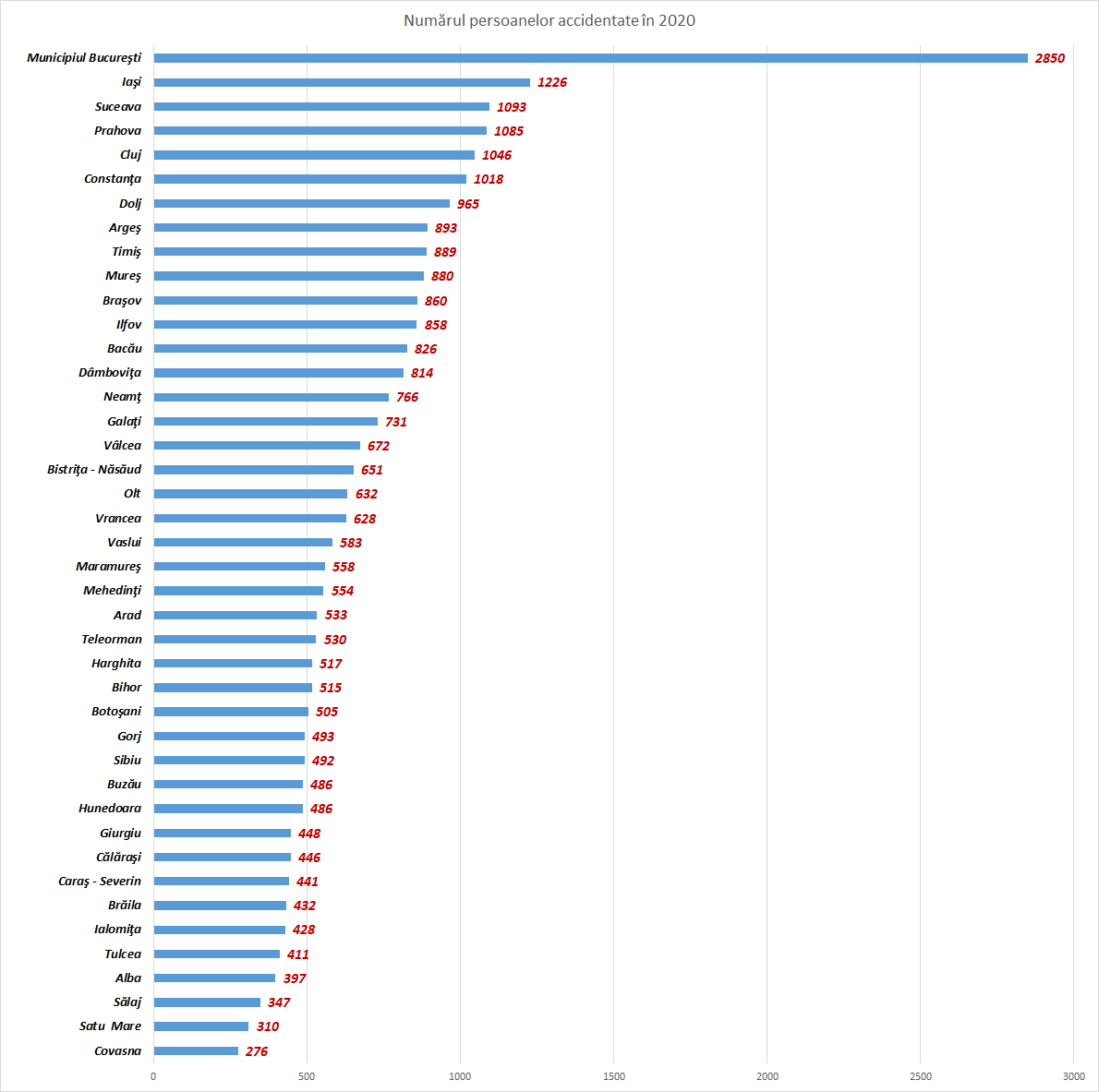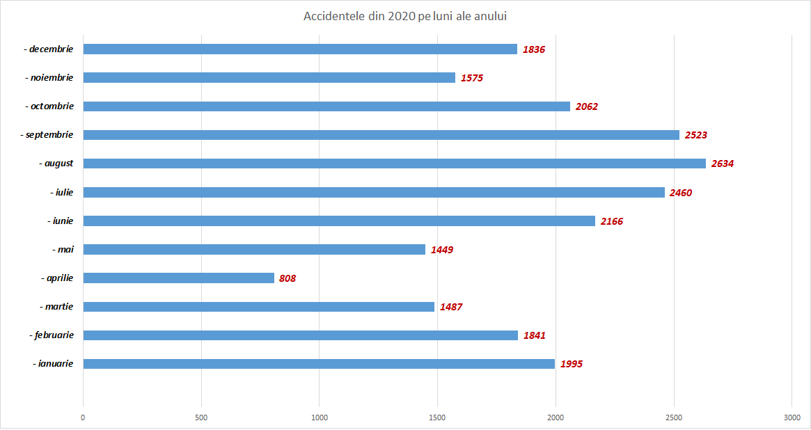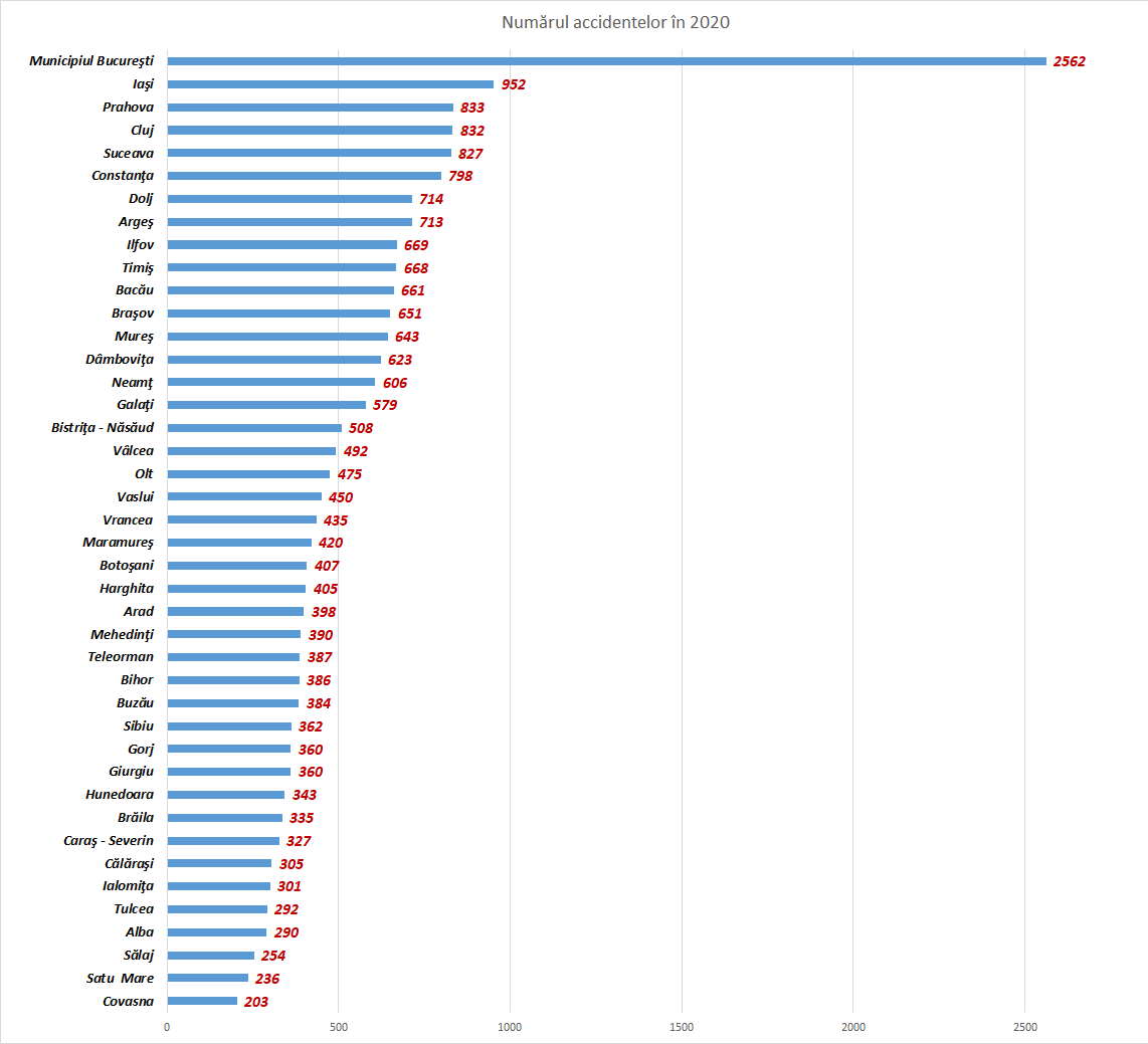 - În cursul anului 2020 s-au înregistrat 22.836 accidente de circulaţie rutieră cauzatoare de vătămări corporale, rezultând 29.571 persoane accidentate, din care 5,6% persoane accidentate mortal. Faţă de anul 2019,numărul persoanelor rănite a scăzut cu 29,6%, cel al accidentelor de circulaţie rutieră cauzatoare de vătămări corporale cu 26,7%, iar cel al persoanelor accidentate mortal a scăzut cu 11,7%. E drept, trebuie avut în vedere faptul că 2020 a fot anul în care am trecut prin perioade de lockdown și de restricții severe de circulație. Prin urmare, comparațiile cu alți ani pot fi nerelevante.