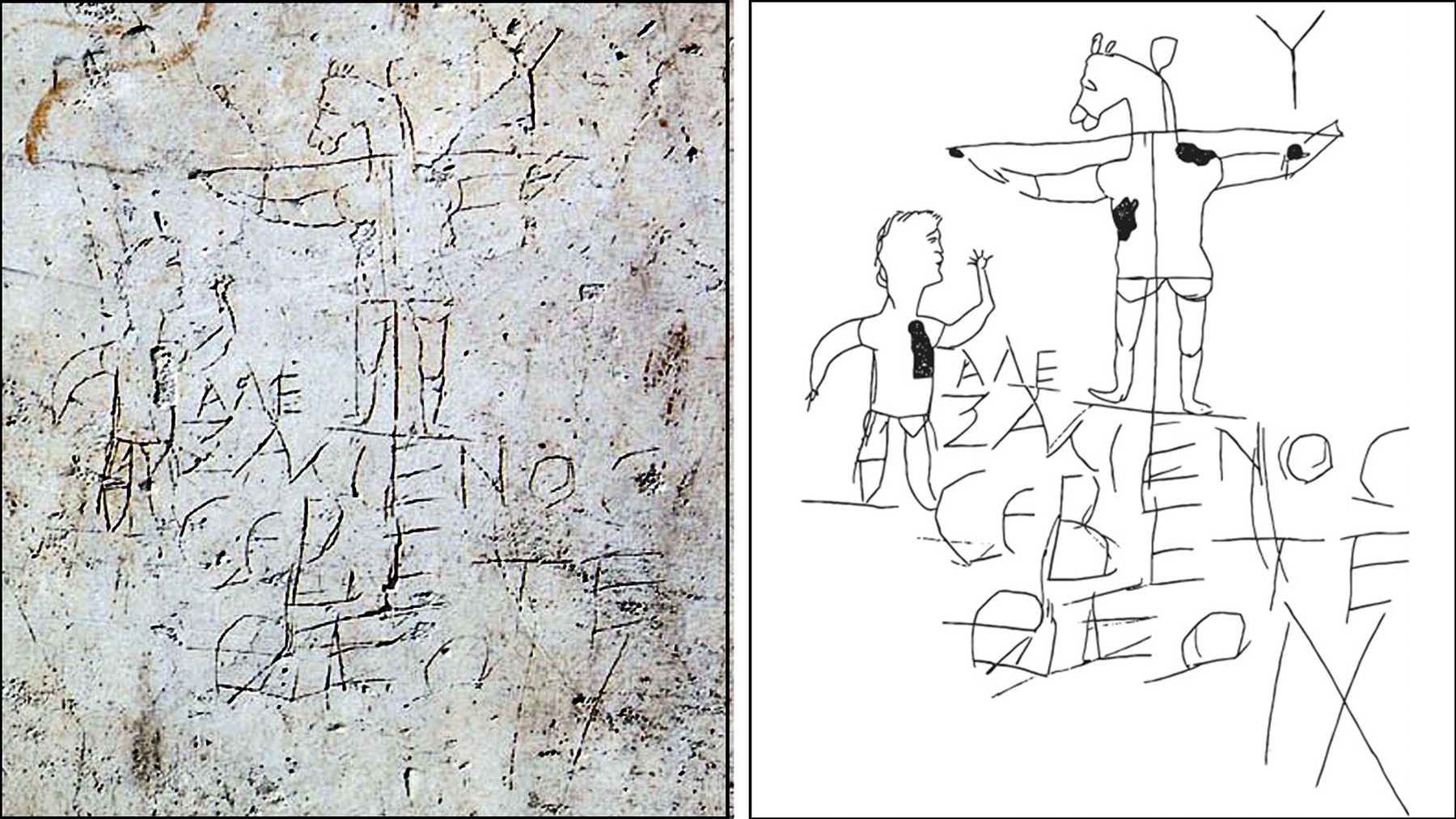 Cineva a scrijelit pe un perete din capitala de atunci a Imperiului Roman un mesaj menit să îl ridiculizeze pe un bărbat numit Alexamenos. El este înfățișat sub o cruce pe care este răstignit un bărbat cu un cap de măgar. „Alexamenos, venerează zeul”, scrie sub imagine. „Graffito Alexamenos” este găzduit în prezent la Museo Palatino din Roma.