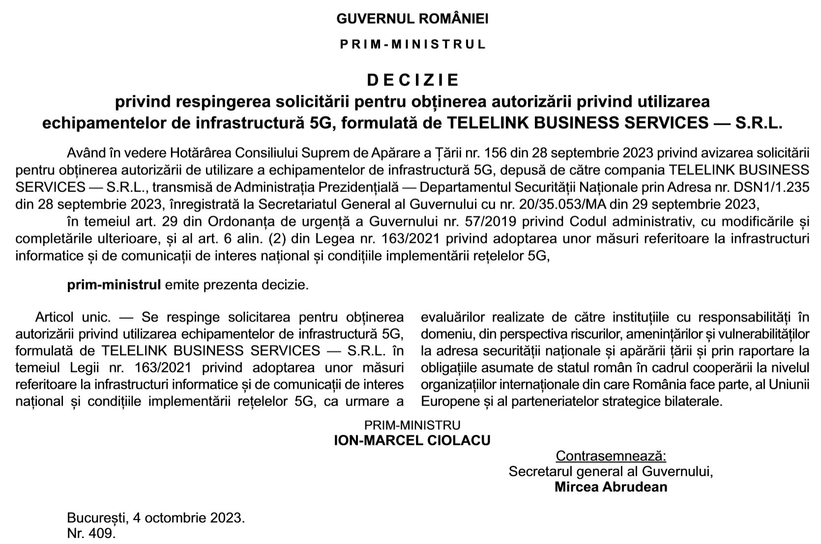 Pe de altă parte, Administrația Prezindențială spune că avizul 5G negativ emis de Consiliul Suprem de Apărare a Țării (CSAT) firmei Telelink Business Services s-a bazat pe faptul că analiza datelor puse la dispoziție de către instituțiile cu responsabilități în domeniul apărării și securității naționale a relevat riscuri la adresa securității și apărării țării.