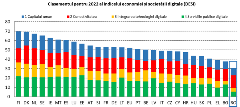 Nu este o noutate pentru nimeni faptul că România stă foarte prost la capitolul digitalizare/transformare digitală. O simplă incursiune în Raportul DESI pe 2024 al Comisiei Europene, ne va arăta faptul că România ocupă ultimul loc în clasament, la mai toți indicatorii, exceptând conectivitatea (dar nu 5G) și numărul de absolvenți în IT (6.8% din totalul absolvenților la nivel național). În rest, la mai toate categoriile oscilăm între ultimul sau penultimul loc.