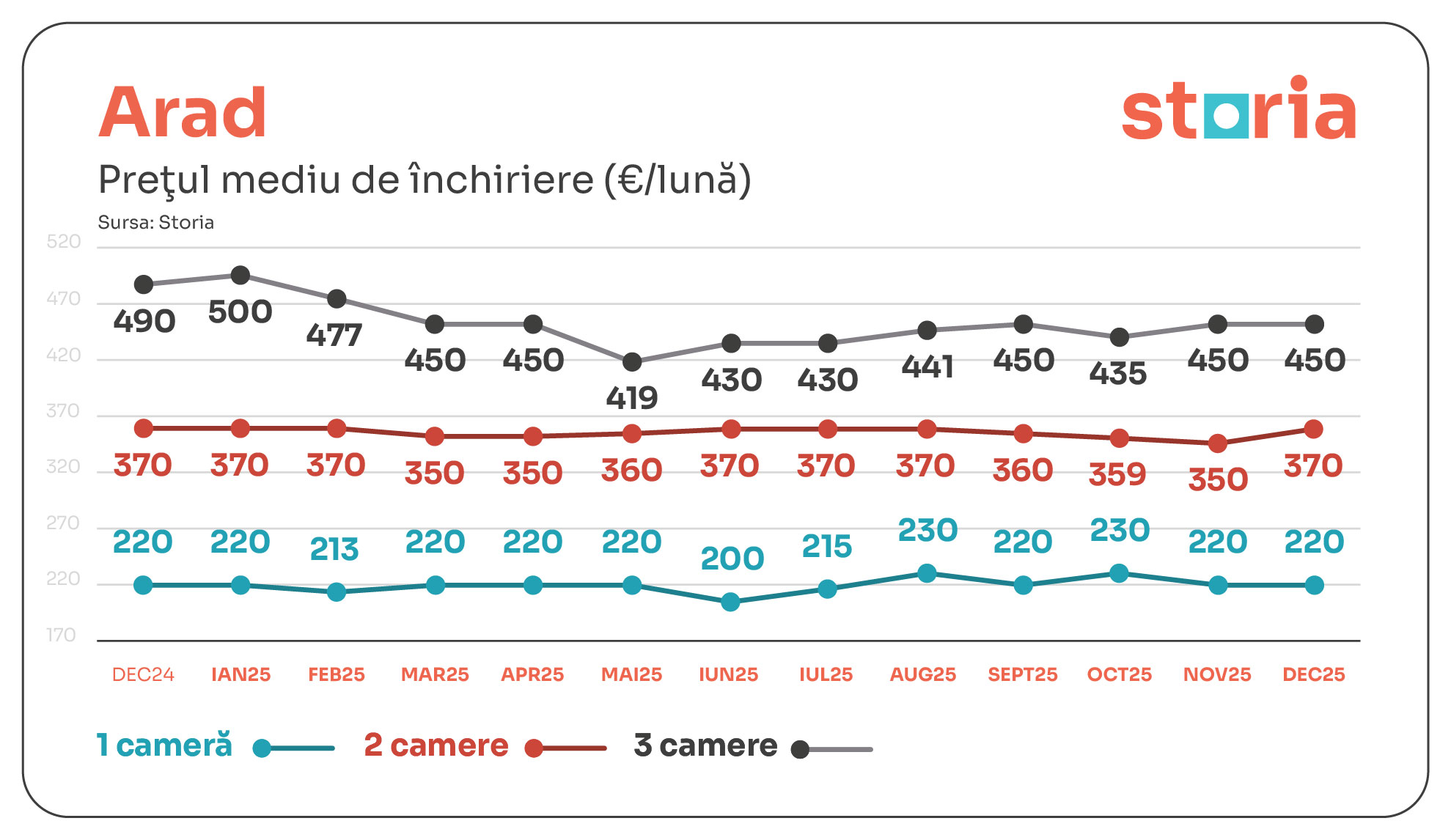 În decembrie, diferențele de preț dintre marile orașe au continuat să fie semnificative. Cluj-Napoca rămâne cel mai scump oraș din perspectiva chiriilor, cu o medie de 400 de euro pentru garsoniere, 560 de euro pentru apartamentele cu două camere și 749 de euro pentru cele cu trei camere. La polul opus, Arad se menține drept orașul cu cele mai ieftine chirii, cu valori medii de 220 de euro pentru garsoniere, 370 de euro pentru apartamentele cu două camere și 450 de euro pentru cele cu trei camere.