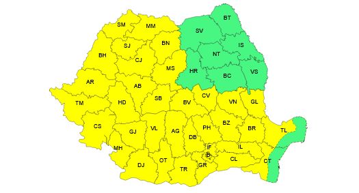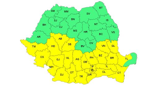 Al doilea Cod galben de vreme deosebit de caldă va fi în vigoare în următoarele județe: Alba, Argeș, Arad, Bihor, Bistrița-Năsăud, Brăila, Brașov, Buzău, Cluj, Călărași, Caraș-Severin, Constanța, Covasna, Dâmbovița, Dolj, Gorj, Galați, Giurgiu, Hunedoara, Ilfov, Ialomița, Mehedinți, Maramureș, Mureș, Olt, Prahova, Sibiu, Sălaj, Satu Mare, Tulcea, Timiș, Teleorman, Vâlcea, Vrancea și Municipiul București.