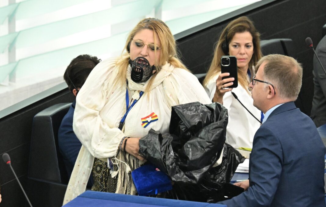Diana Șoșoacă protestează, purtând o botniță, în Parlamentul European, Strasbourg, Franța, pe 18 iulie 2024.