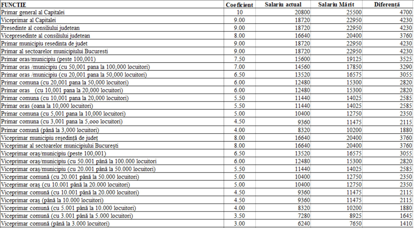 În cazul primarilor, aceștia vor primi în plus de la 1.880 de lei brut, în cazul unei comune de până la 3.000 de locuitori, și până la 4.700 de lei brut în cazul primarului Bucureștiului.