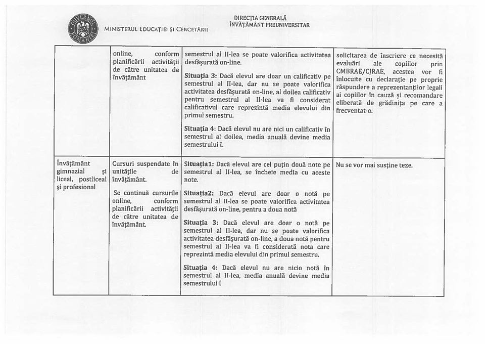 Consultă aici:Documentul in care sunt prevăzute măsurile pentru reluarea cursurilor și încheierea mediilor