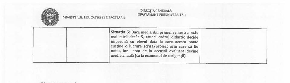 Situația 5: Dacă media din primul semestru este mai mică decât 5, atunci cadrul didactic decide împreună cu elevul data la care acesta poate susține o lucrare scrisă/proiect prin care să fie notat, iar nota de la această evaluare devine media anuală (ca la examenul de corigență)