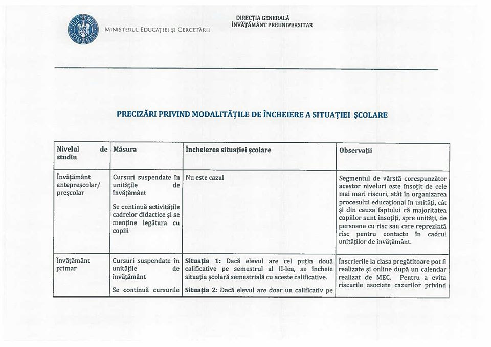 Ministerul Educației aduce precizări privind modalitățile de încheiere a situației școlareDocumentul arată că pentru învățământul ante-preșcolar și preșcolar nu este cazul încheierii situației, dar activitățile cadrelor didactice continuă și acestea mențin legătura cu copiii.