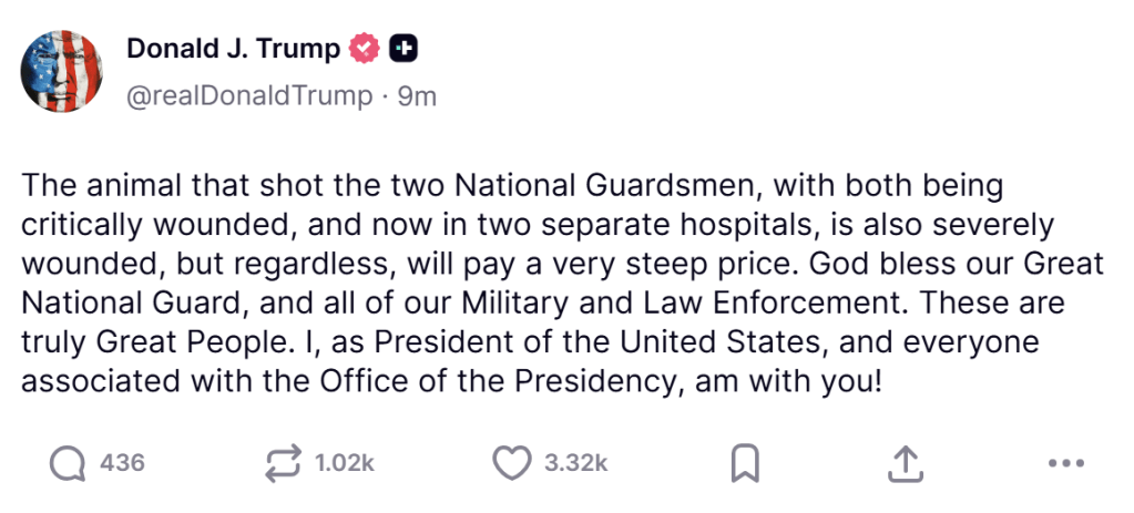 „Animalul care i-a împușcat pe cei doi membri ai Gărzii Naționale – ambii fiind în stare critică, aflați acum în două spitale diferite – este și el grav rănit, dar, indiferent de asta, va plăti un preț foarte mare. Dumnezeu să binecuvânteze Marea noastră Gardă Națională și toate forțele noastre militare și de ordine. Aceștia sunt cu adevărat oameni minunați. Eu, în calitate de președinte al Statelor Unite, și toți cei asociați cu Biroul Președinției, suntem alături de voi!”, este mesajul postat de Donald Trump la scurt timp după incident.