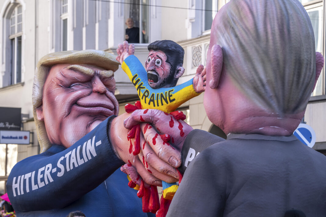Car alegoric cu Vladimir Putin și Donald Trump care își strâng mâinile și îl zdrobesc pe președintele Ucrainei Volodimir Zelenski în o manifestație în Renania de Nord-Westfalia, Germania. Sursă foto: Jochen Tack / imageBROKER / Profimedia