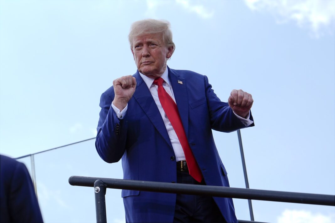 Candidatul republican la președinție, fostul președinte Donald Trump, la un miting de campanie, la North Carolina Aviation Museum, pe 21 august 2024, în Asheboro, N.C.