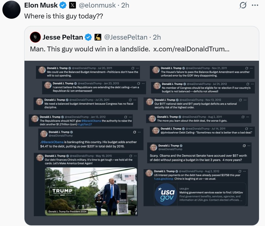 El a postat apoi numeroase mesaje pe X și distribuit mai multe mesaje vechi ale Donald Trump, din 2012 și 2013, în care acesta îi critica pe republicani că au ridicat plafonul datoriei publice.